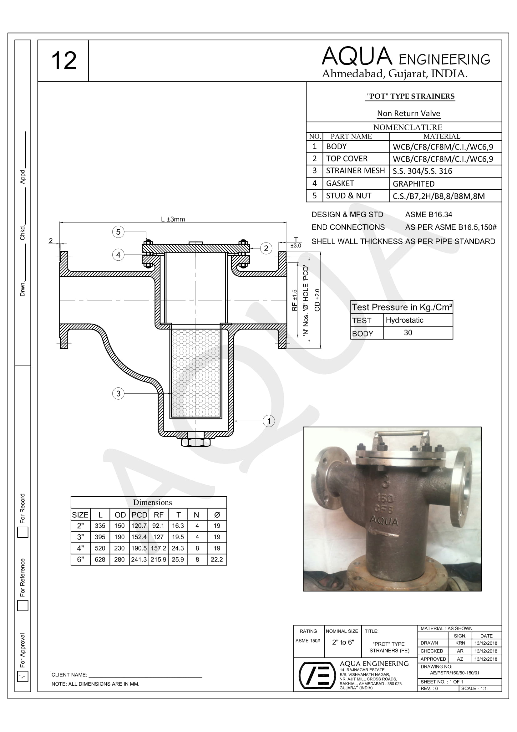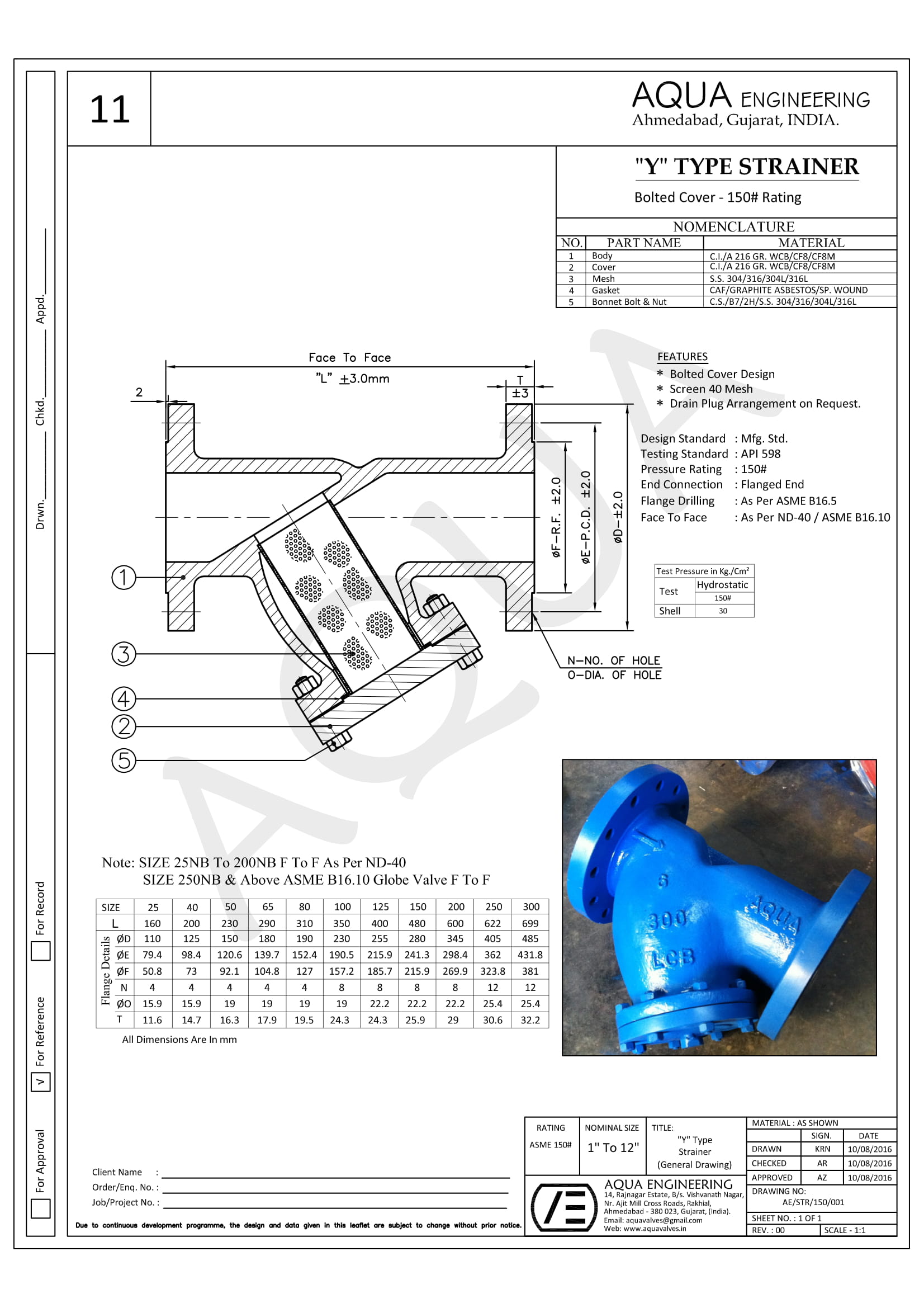 AQUA Strainer 150# ANSI Flanged strainers are available in Carbon Steel, Stainless Steel and Bronze. A machined, tapered seat ensures a perfect fit for the removable, stainless steel screen. 2″ and larger come complete with flanged blow-off cover, gasket & plug. 1 1/2″ and smaller come complete with solid threaded cover and gasket. May be installed in vertical or horizontal pipelines with blow-off connection at the lower end of the screen.